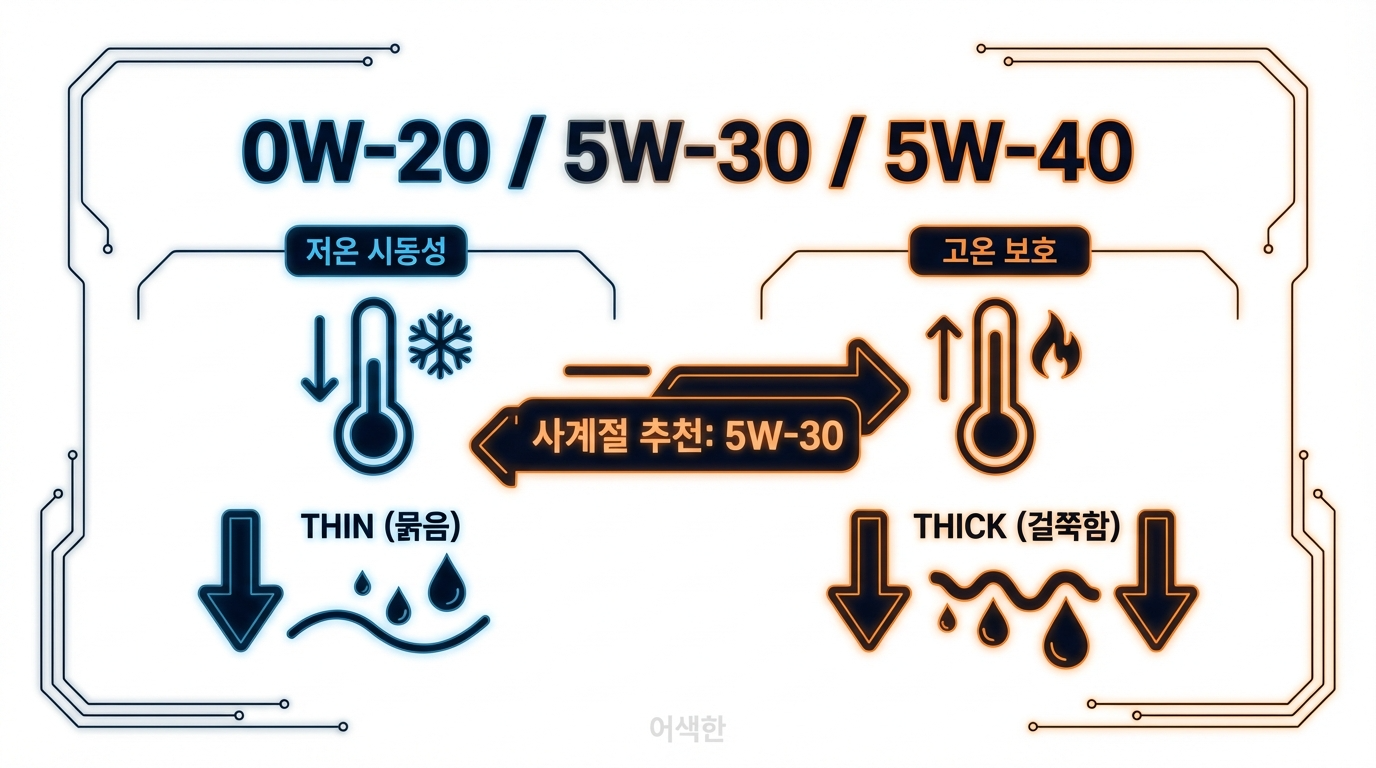 | 5W30 | 묽음(-30℃) | 중간 | 가장 보편적 |