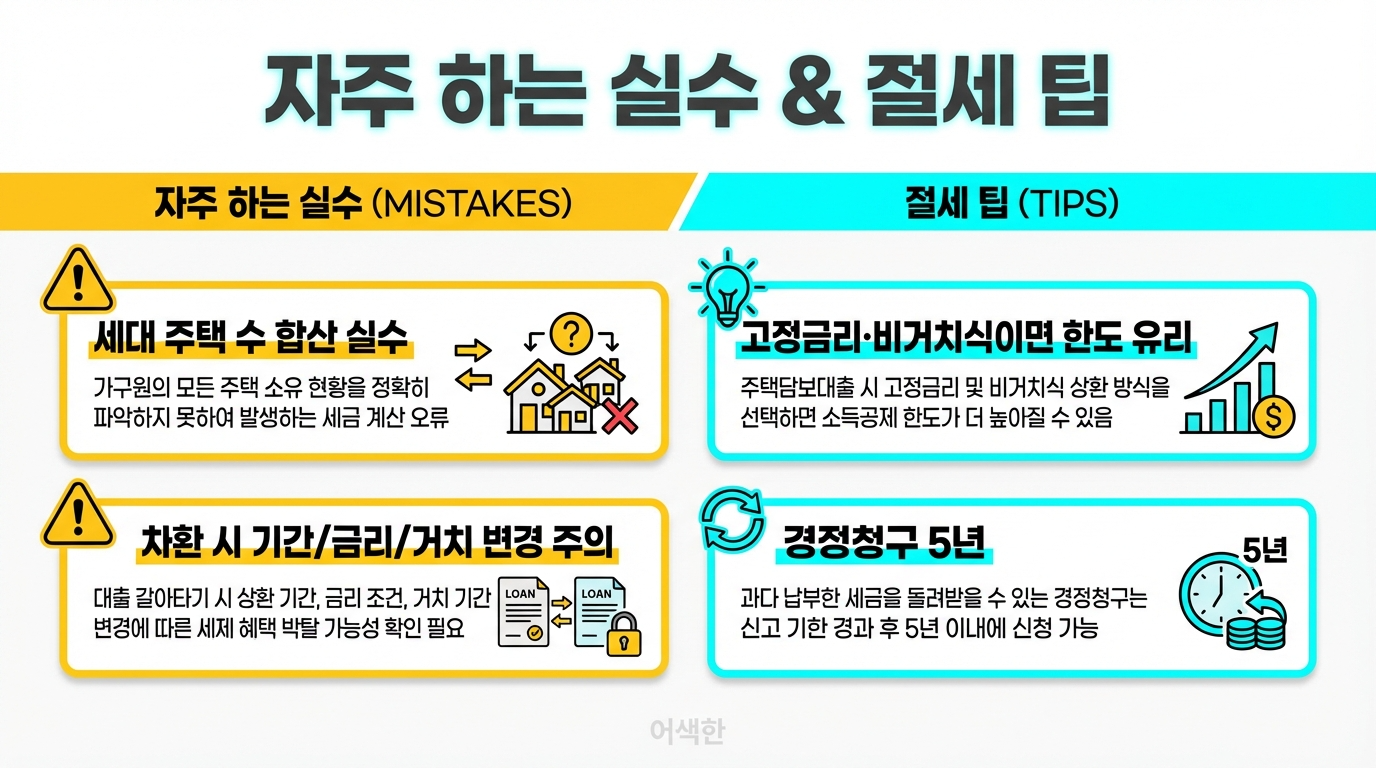 대출을 차환할 때도 주의가 필요합니다. 기존 대출을 갚고 새로운 대출로 바꾸는 차환의 경우, 새 대출의 상환기간이 기존 대출보다 짧아지면 공제한도가 낮아지거나 공제 자체가 불가능해질 수 있습니다. 차환 시에는 반드시 상환기간을 기존과 같거나 길게 유지하고, 고정금리 및 비거치식 조건도 확인하세요.
