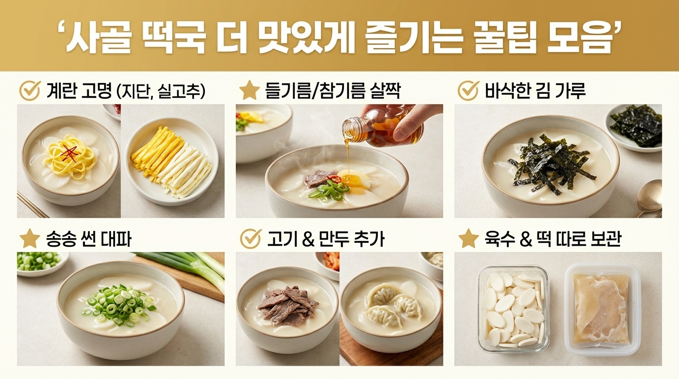 기본 레시피를 완성했다면 이제 한 단계 업그레이드해볼 차례입니다. 전문점처럼 맛있는 사골 떡국을 만드는 추가 꿀팁들을 모아봤습니다.