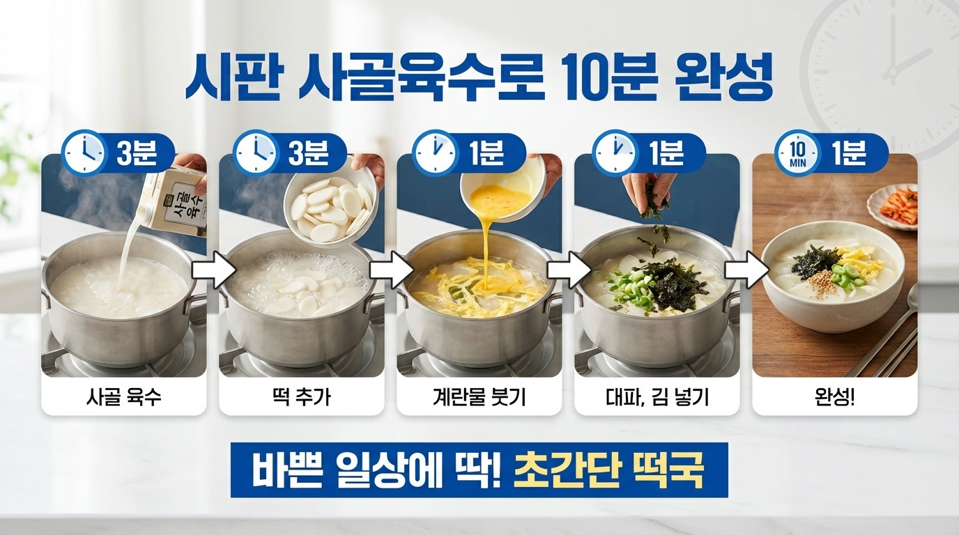 바쁜 아침이나 갑자기 떡국이 먹고 싶을 때 시판 사골육수를 활용하면 10분 만에 전문점 맛 떡국을 완성할 수 있습니다. 라면 끓이는 것보다 더 쉬운 초간편 레시피를 소개합니다.