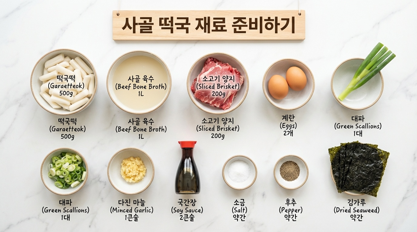 기본 재료를 준비해볼까요? 2~3인분 기준으로 떡국떡 300~350g, 사골육수 1L(시판 또는 직접 우린 것), 소고기 양지나 사태 100g, 달걀 2개, 대파 1대, 다진 마늘 1큰술이 필요합니다. 여기에 국간장, 소금, 후춧가루로 간을 맞추고, 김 1장을 고명으로 올리면 완벽합니다.