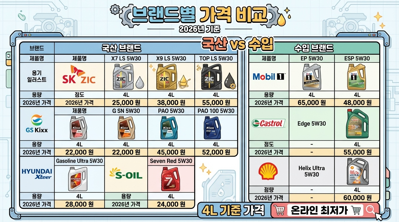 2026년 현재 국내에서 인기 있는 엔진오일 브랜드는 SK 지크, GS칼텍스 킥스, 현대 엑스티어, 에쓰오일 등 국산 브랜드와 모빌원, 캐스트롤, 쉘 등 수입 브랜드가 있습니다 브랜드와 등급에 따라 가격 차이가 크므로 자신의 차량과 예산에 맞게 선택하는 것이 중요합니다